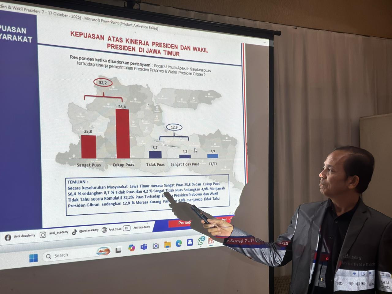 Direktur ARCI, Baihaki Sirajt membeberkan 82,2% responden warga Jawa Timur mengaku puas dengan kinerja Prabowo-Gibran selama satu tahun memimpin Indonesia sejak 20 Oktober 2024.