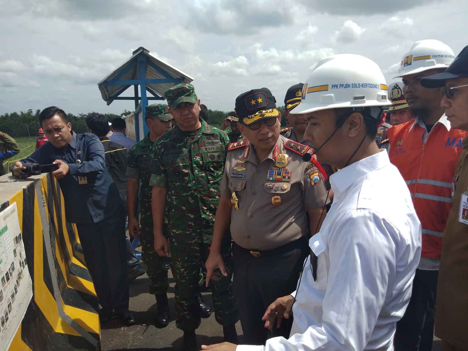 Kapolda dan Pangdam didampingi Pj Bupati Jombang Setiadjit, Kapolres Jombang AKBP Fadli, mendapatkan penjelasan dari perwakilan pimpinan proyek pembangunan Jembatan Kali Kunto.