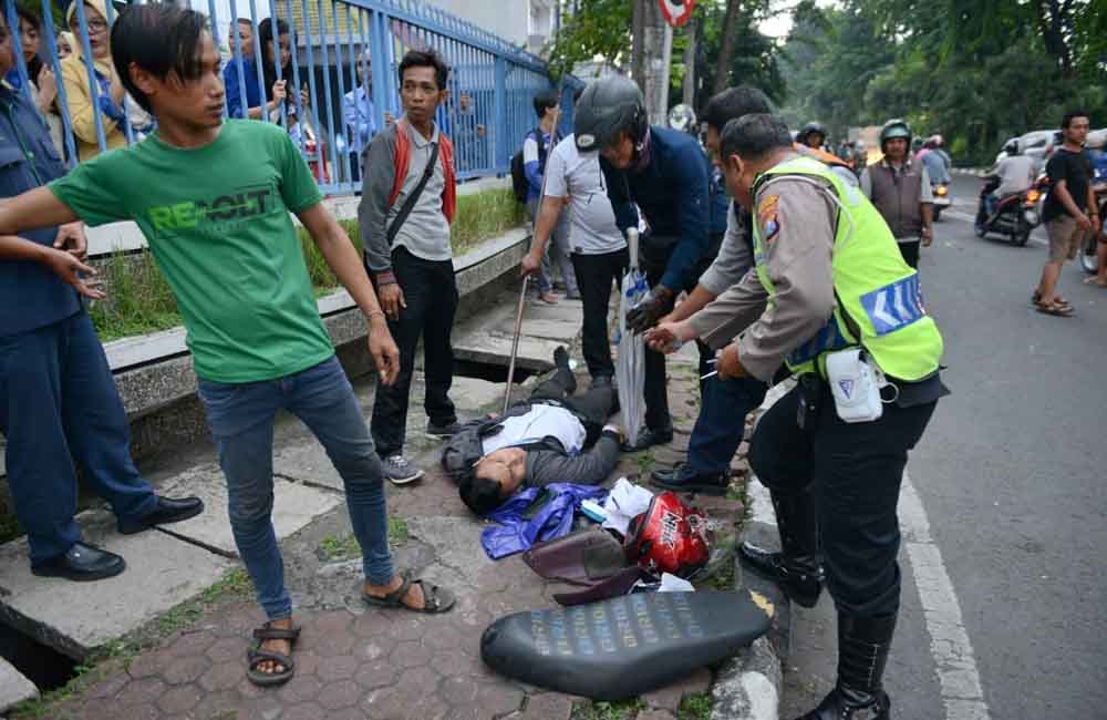 Pengendara motor yang diketahui bernama Ferry Pramusi terkapar di trotoar usai ditabrak pikap.