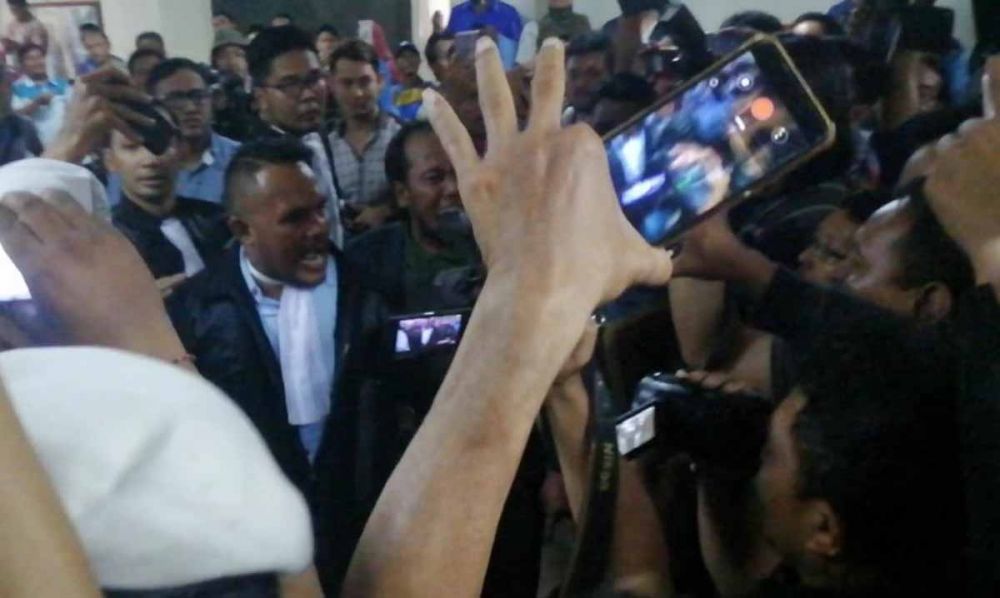 Tak lama kemudian, salah satu orang pendukung Ahmad Dhani meneriakkan takbir. Hal itu membuat suasana semakin panas lantaran teriakan tersebut berada di sebelah salah satu wartawan yang sedang meliput.