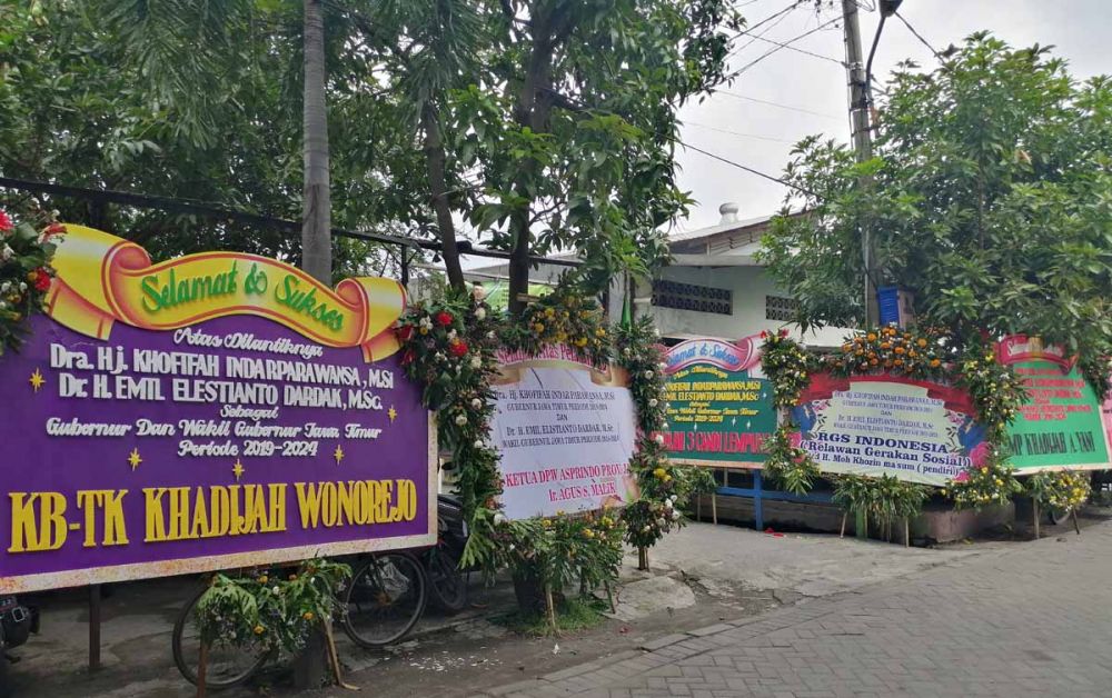 Di sekitar kediaman Khofifah, karangan bunga ucapan selamat tersebut terlihat datang dari berbagai kalangan, salah satunya bertuliskan dari tempat Khofifah mengemban pendidikan jenjang menengah pertama dan menengah atas yakni SMP dan SMA Khadijah.