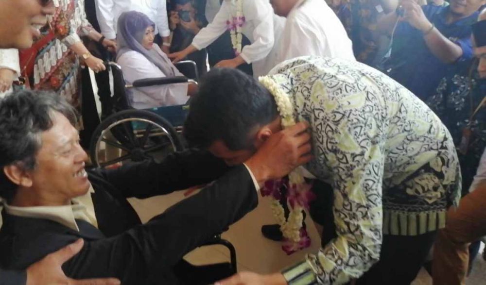 Dari pantauan jatimnow.com, Khofifah dan Emil disambut dengan pengalungan bunga oleh dua orang penyandang difabel. Dari kursi roda, dua difabel laki-laki dan perempuan itu mengalungkan bunga kepada Khofifah dan Emil.