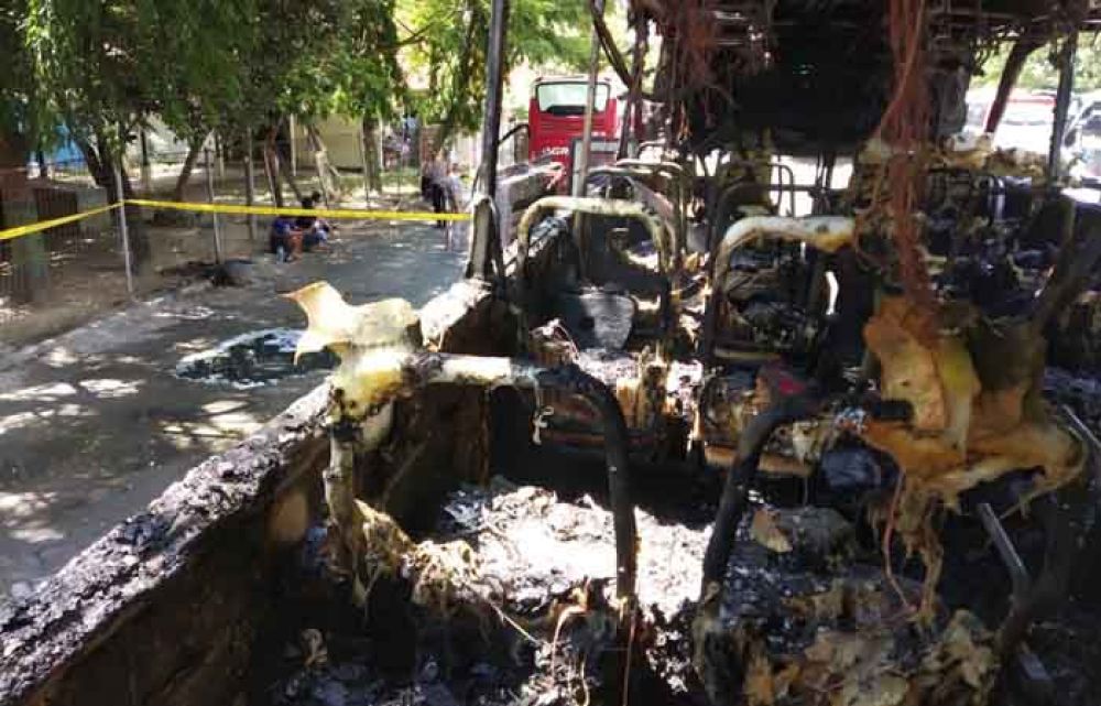 Kini bangkai bus yang terbakar lebih dari 50 persen ini masih berada di area Terminal Rajekwesi.