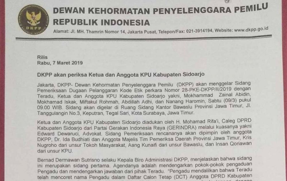 Ketua dan anggota KPU Kabupaten Sidoarjo tersebut diadukan oleh Mohamad Rifa'i, Calon Anggota DPRD Kabupaten Sidoarjo dari Partai Gerindra melalui kuasanya, Edward Dewaruci.