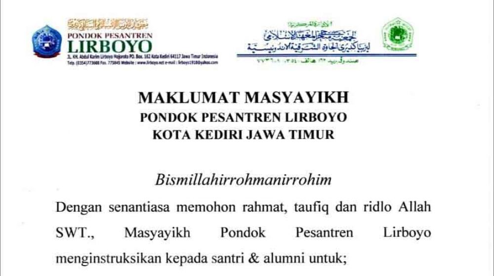 Maklumat ini ditandatangani oleh Pengasuh Ponpes Lirboyo, KH M Anwar Manshur dan Ketua Umum Pengurus Pusat Himpunan Alumni Santri Lirboyo, KH Abdullah Kafabih Mahrus. Maklumat ini dikeluarkan resmi sejak, Selasa (12/3/2019) dan sudah menyebar di media sosial.