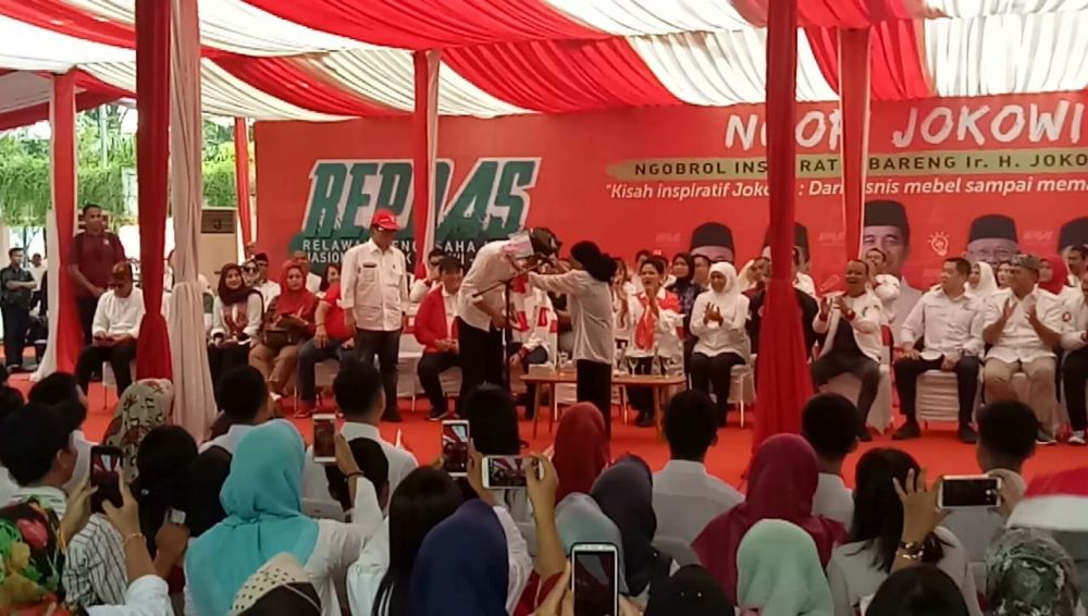 Saat itu juga, Ibu Suherman, mengalungkan syal berwarna merah putih yang telah dipersiapkan sebelumnya kepada Jokowi.