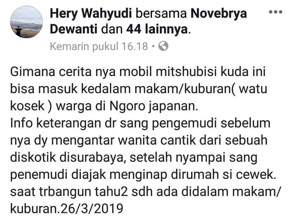 "Haduuuh ....Gimana cerita nya mobil mitshubisi kuda ini bisa masuk kedalam makam/kuburan( watu kosek ) warga di Ngoro Japanan.Info keterangan dr sang pengemudi sebelum nya dy mengantar wanita cantik dari sebuah diskotik disurabaya, setelah nyampai sang penemudi diajak menginap dirumah si cewek. saat trbangun tahu2 sdh ada didalam makam/kuburan" tulis kedua akun tersebut.
