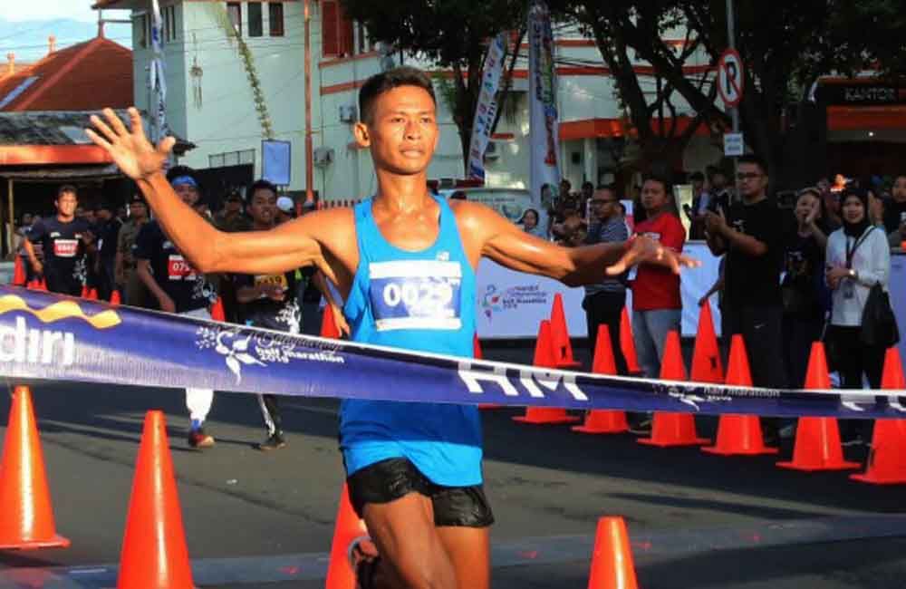 jatimnow.com - Anggota TNI AD berhasil menjadi juara pada ajang Mandiri Banyuwangi Half Marathon 2019. Dengan catatan waktu 1 jam 29 menit 19 detik, Chamit Nur Cholis berhasil menyelesaikan lintasan sejauh 21 KM.
