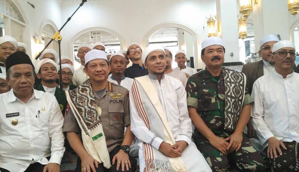 jatimnow.com - Panglima TNI Marsekal Hadi Tjahjanto dan Kapolri Jendral Tito Karnavian menghadiri doa bersama di Pondok Pesantren (Ponpes) Darul Lughoh Wadda'wah (Dalwa) Kecamatan Bangil, Kabupaten Pasuruan, Selasa (2/4/2019).