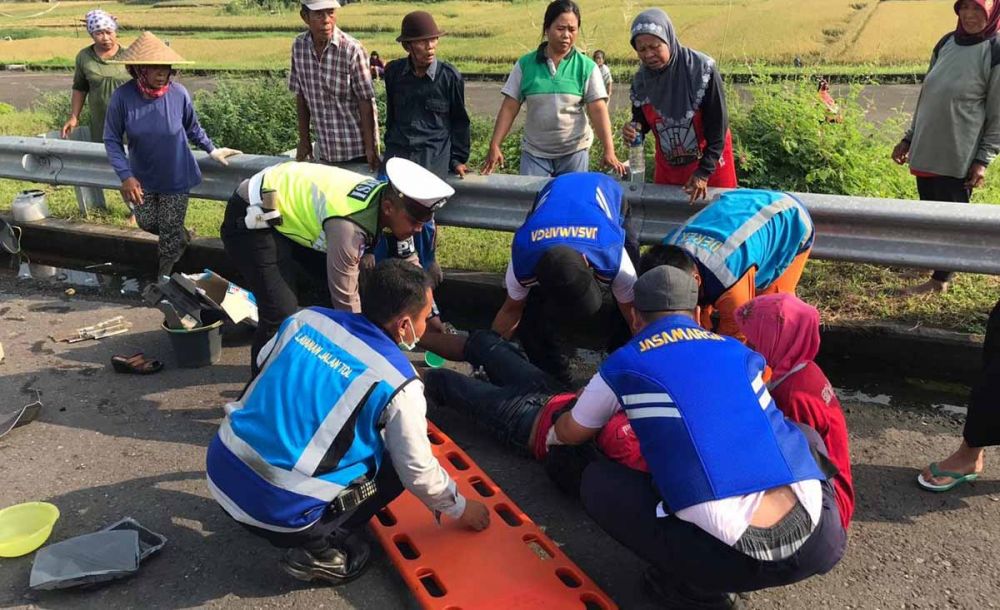 jatimnow.com - Sebuah mobil Daihatsu Gran Max jenis pikap terguling dua kali di KM 740.200 Tol Surabaya-Mojokerto (SuMo), Senin (8/4/2019). Akibat kecelakaan tunggal itu, seluruh penumpang yaitu lima orang mengalami luka serius, satu di antaranya bahkan kritis.
