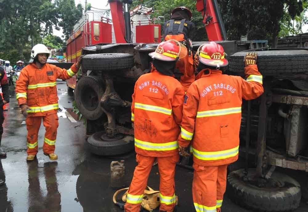 Selain kecelakaan Grand Max, sebuah truk engkel bermuatan dua batang besi terguling di Jalan Anggrek,