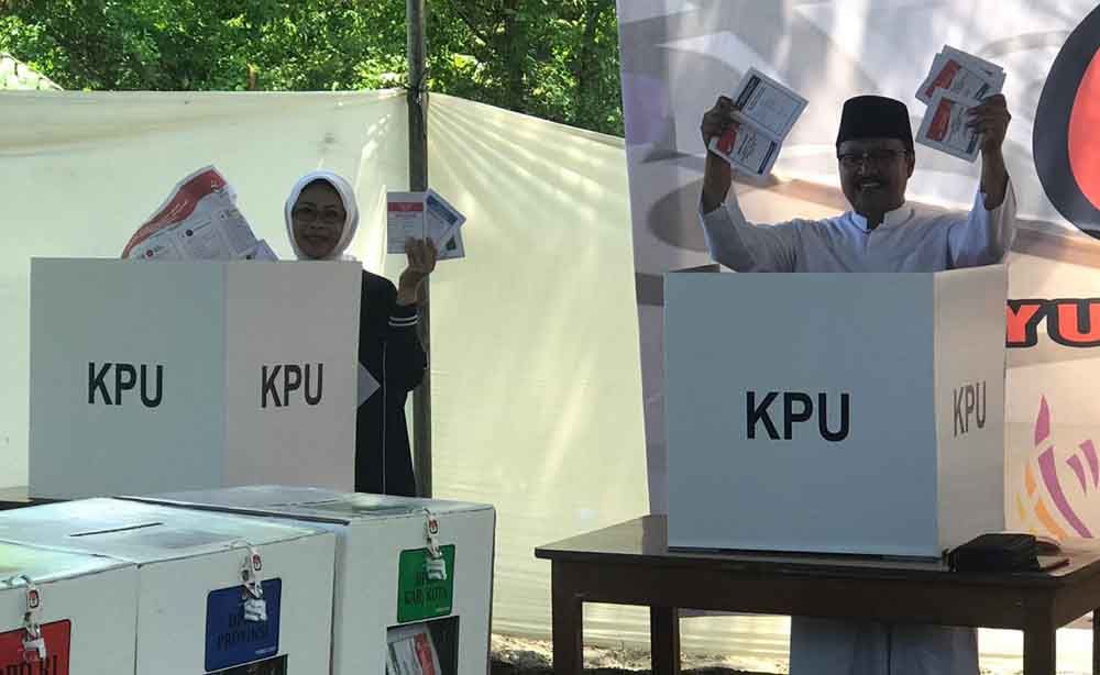 Pungkasiadi dan istrinya juga memakai baju putih datang ke TPS.