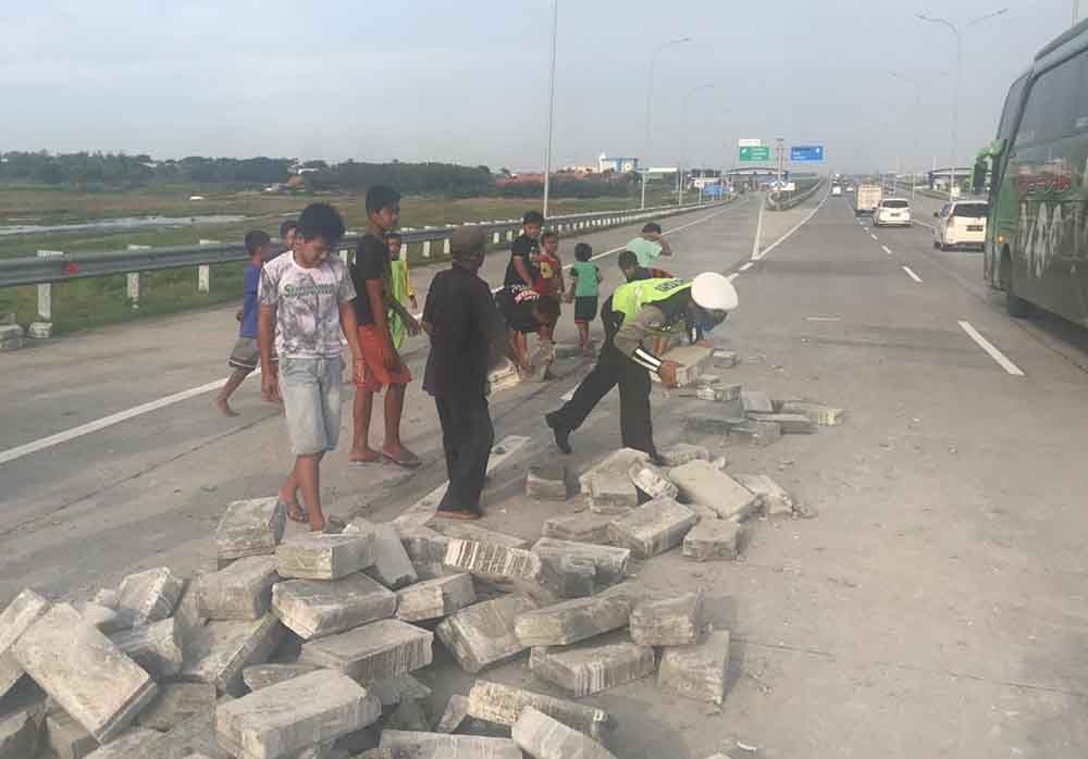 Kelebihan Muatan, Truk Angkut Bata Ringan Terguling di Tol Sumo
