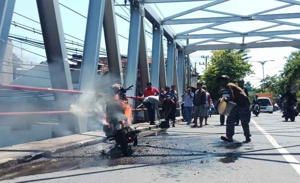 jatimnow.com - Sebuah motor terbakar saat melintas di tengah jembatan sungai kedung larangan (swadesi), Pasuruan, Minggu (21/4/2019). Api memnghanguskan motor Honda Supra bernopol W 2476 PY yang dikendarai Ismoyo.