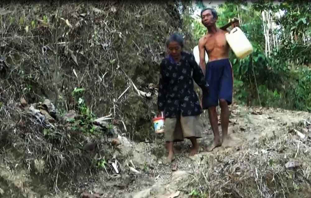 Pasangan yang tidak memiliki keluarga ini harus berjalan sejauh 1 Km hanya untuk mengambil air. Itupun harus berjalan dengan tertatih lantaran memandu suaminya yang buta dengan sebilah bambu.