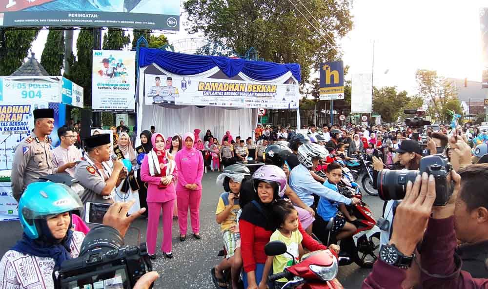 AKBP Nasrun bersama sang istri membagikan 2.900 paket takjil gratis bagi pengguna jalan. Ribuan takjil ludes dalam waktu 1 jam saja.