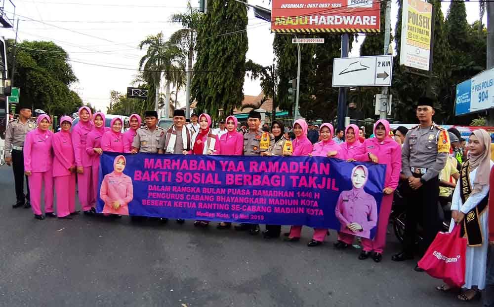 jatimnow.com - Polisi di Madiun menggelar acara bagi takjil untuk pengguna jalan di Simpang Lima, Kamis (16/5/2019). Bagi takjil ini dipimpin langsung oleh Kapolres Madiun Kota, AKBP Nasrun Pasaribu berserta istri, Neni Nasrun Pasaribu.