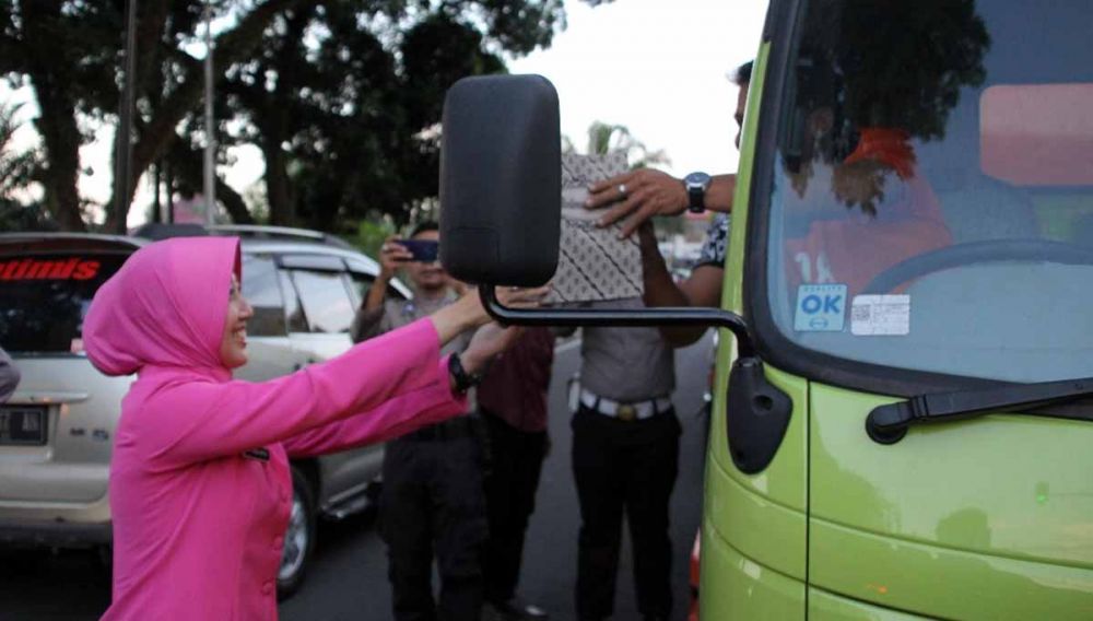 Dibantu para polisi berseragam lengkap, Diana dan puluhan Ibu-ibu Bhayangkari berjajar di pinggir jalan. Mereka mengulurkan tangan berisi bingkisan menu takjil kepada para pengguna jalan yang sudah mengantre.