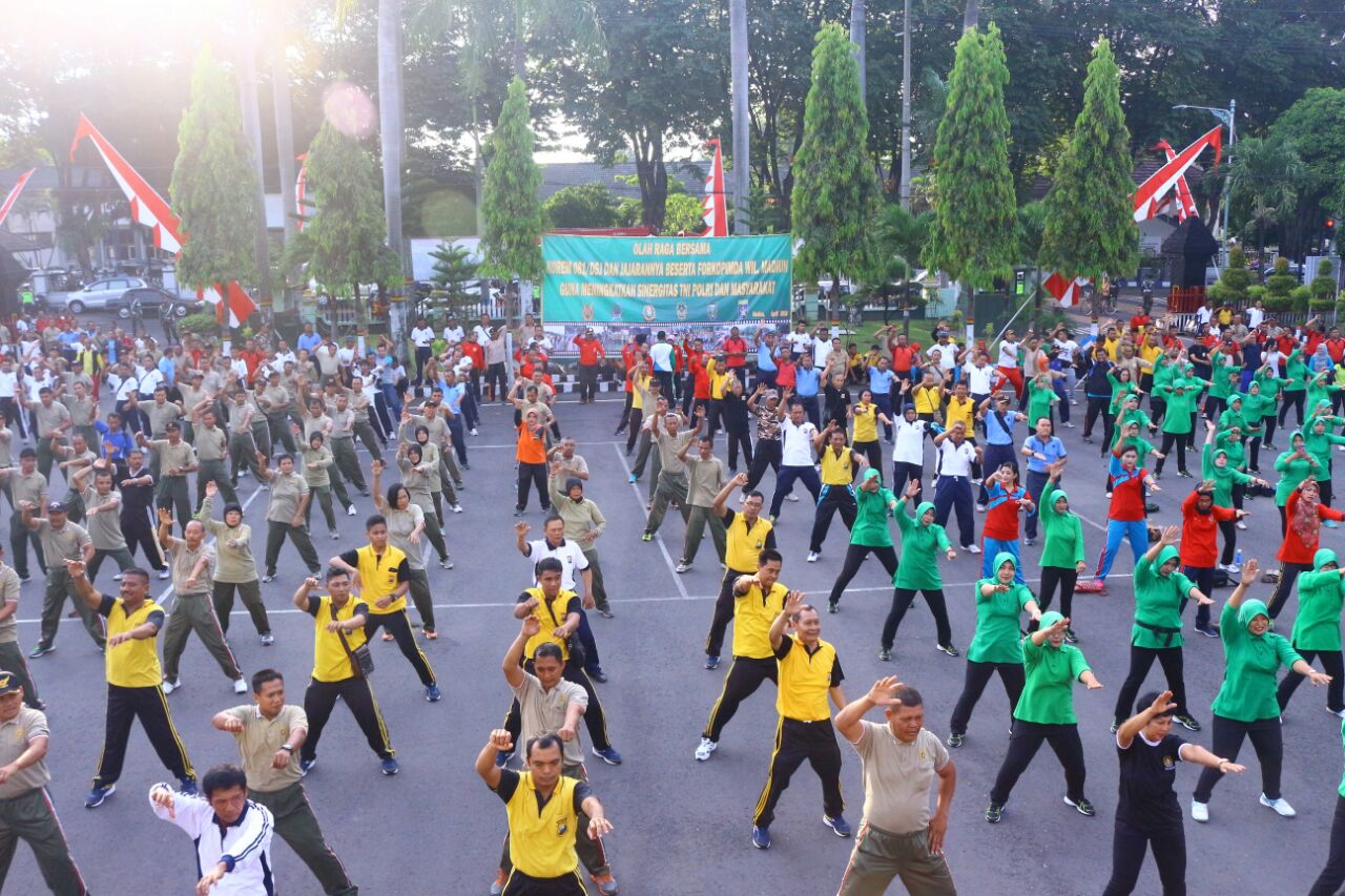 jatimnow.com - Menuju terwujudnya Pilkada damai 2018 dan Pilpres 2019, 3 Pilar Kabupaten Madiun menggelar olahraga bersama, Jumat (13/4/2018) di Makorem 081 Madiun.