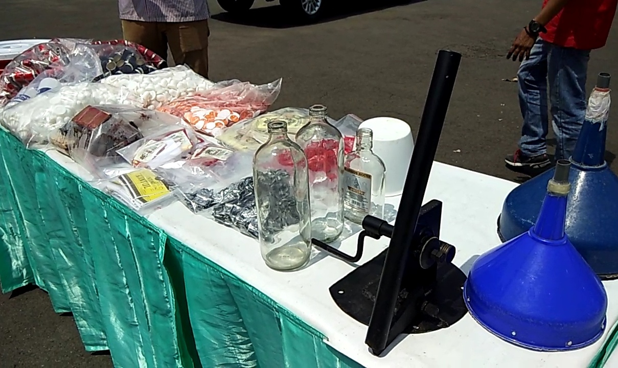 1 buah mesin pres, 2 kompor gas, 4 buah tabung gas ukuran 3 Kg, 25 kardus berisi botol Kuntul kosong 12 botol, 2 kardus berisi botol kosong Vodka 24 botol, 10 kardus botol Mansion kosong 24 botol, 2 kantong tutup botol Mansion, 1 kantong tutup botol Kuntul.