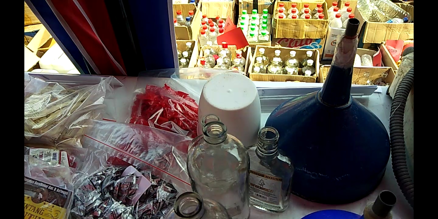 1 kantong tutup botol Vodka, 1 bendel label merk Mansion, 1 kantong plastik label merek Vodka, 2 botol merek Povinal, 5 buah drum plastik, 4 buah corong plastik, 2 buah gayung 1 buah stampel, 1 buah papan yang dipakai sebagai alas untuk pasang label.