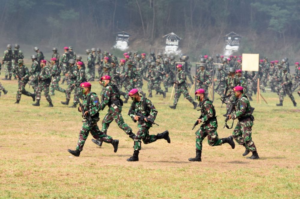 jatimnow.com - Sebanyak 1474 prajurit petarung Korps Marinir menembak serentak di lapangan tembak Internasional FX Soepramono Bhumi Marinir, Karang Pilang Surabaya, Sabtu (7/12/2019).