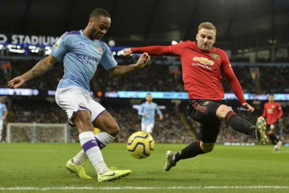 Bek Manchester United (MU) Luke Shaw (kanan) berusaha menahan tendangan winger Manchester City Rahem Sterling.