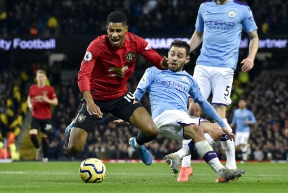 Penyerang Manchester United (MU) Marcus Rashford (kiri) dijatuhkan Bernardo Silva di kotak penalti Manchester City.