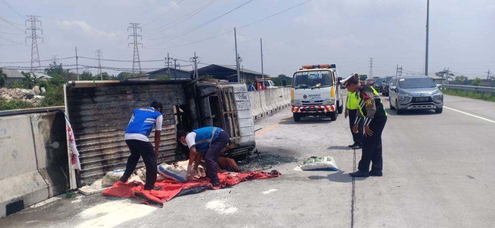 jatimnow.com - Sebuah mobil pikap yang memuat beras bernopol L 9103 AQ mengalami kecelakaan dan terbakar di Tol Surabaya - Mojokerto (Sumo) tepatnya di KM 732.600, Rabu (25/12/2019).
