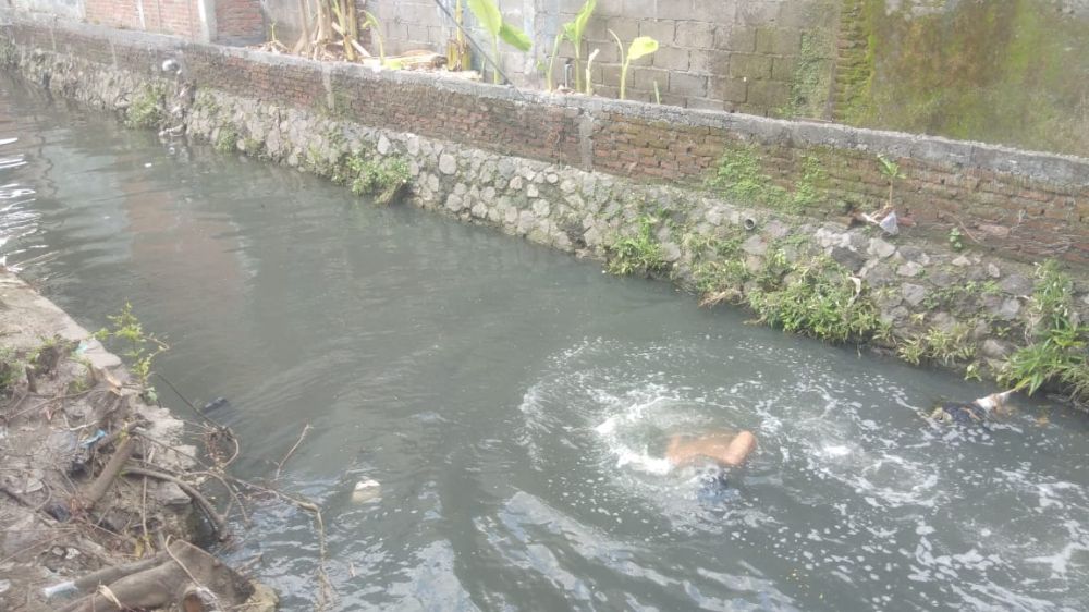 Tanpa takut, mereka beratraksi dengan melompat dan berenang di kali meski kondisi airnya yang hitam. Anak-anak tersebut tidak menghiraukan kondisi sungai.