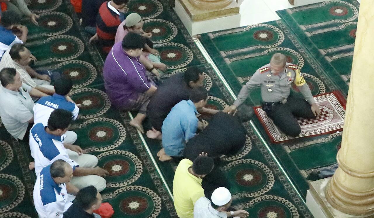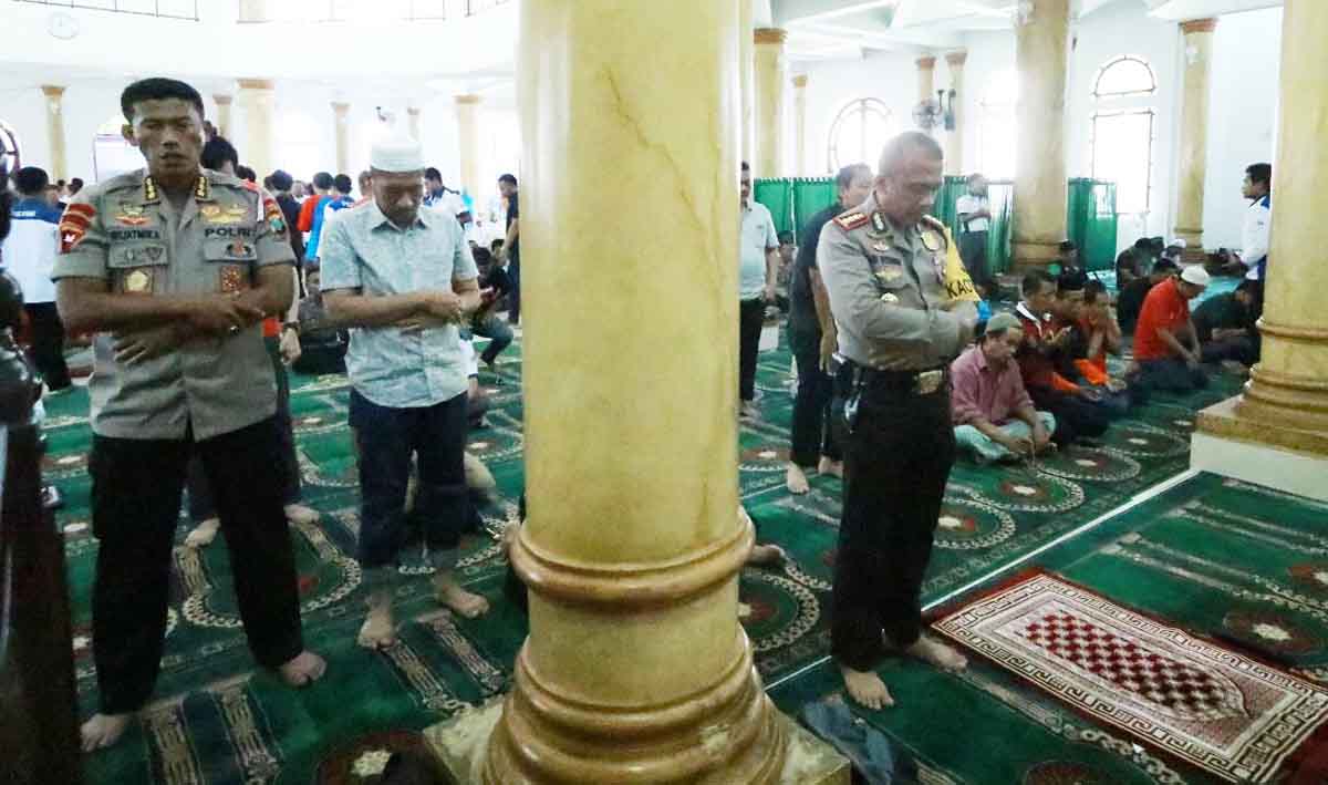 Di sela aksi di saat memasuki waktu salat Dzuhur, Kapolrestabes Surabaya, Dansat Brimob Polda Jatim, anggota kepolisian bersama para buruh melaksanakan salat di Masjid Baitul Hamdi komplek kantor Gubernur Jatim.
