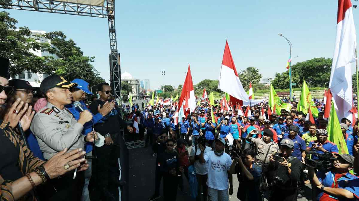Aksi May Day di depan kantor Gubernur Jatim Jalan Pahlawan, Surabaya, Selasa (1/5/2018) berjalan damai.