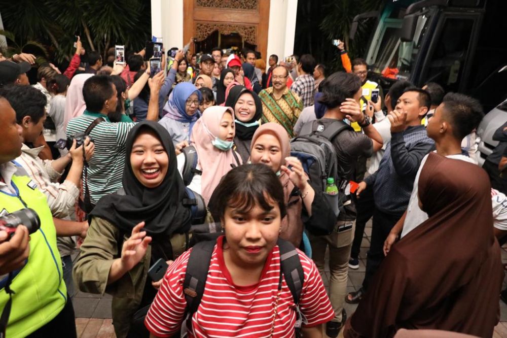 "Alhamdulillah setelah proses observasi 14 hari, mereka sehat semua kembali malam ini. Kami ingin memastikan mereka semua baik-baik saja dan sehat. Dan kita bisa melihat ada suasana haru, bahagia dan ceria," kata Gubernur Khofifah.