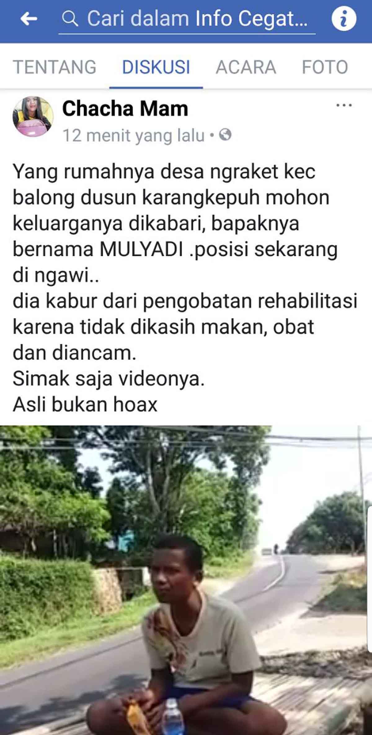 Dalam postingan tersebut Chacha Mam, membagikan video, 'Yang rumahnya Desa Ngraket, Kecamatan Balong, Dusun Karangkepuh mohon keluarganya dikabari, bapaknya bernama MULYADI.