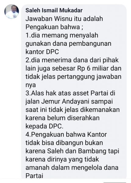 "Dia memang menyalah gunakan dana pembangunan kantor DPC," tulis Saleh di halaman komentar Facebook grup "Forum Komunikasi BANTENG LAWAS BERSATU". Ada 4 poin yang ditulis Saleh menanggapi pertanyaan anggota grup yang lain.