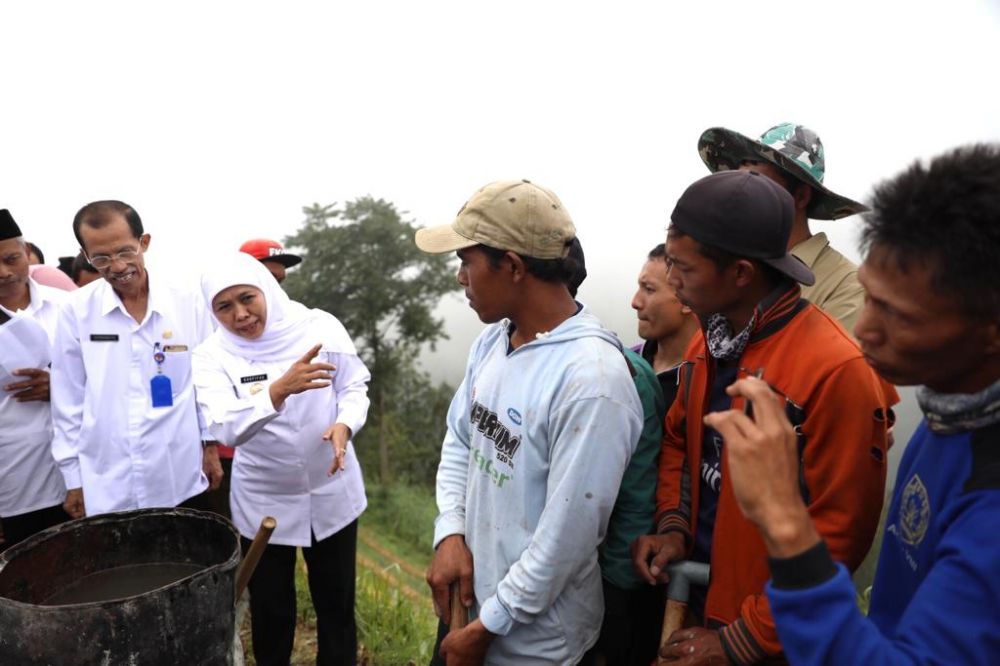 jatimnow.com - Gubernur Jawa Timur, Khofifah Indar Parawansa memantau proyek padat karya tunai Program Dana Desa sebesar Rp 1,187 Miliar di lereng Gunung Lawu, di Dusun Wonomulyo, Desa Genilangit, Kecamatan Poncol, Kabupaten Magetan, Rabu (11/3/2020).