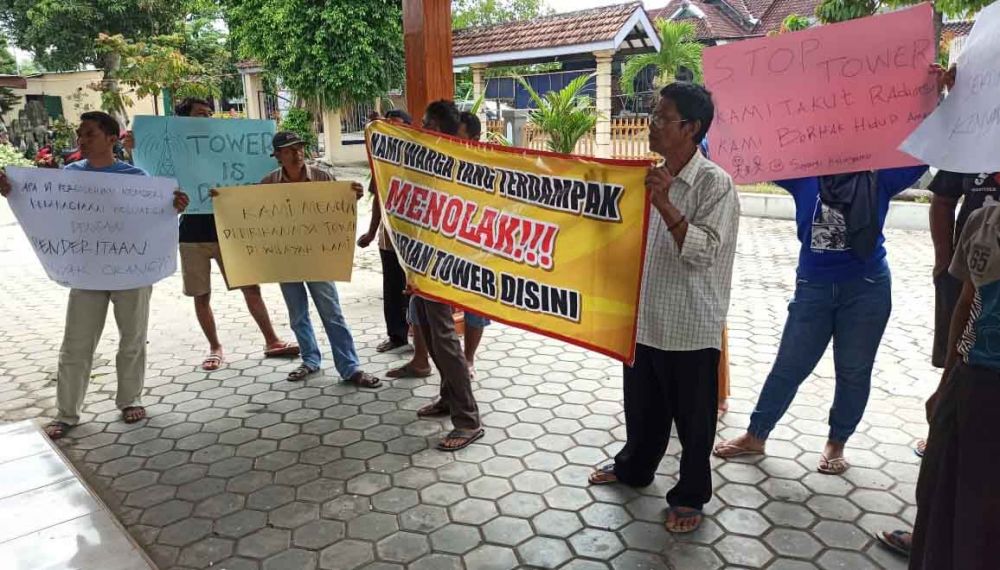 Dalam aksinya, belasan warga yang melakukan demo membawa banner bertuliskan 'Kami Warga yang Terdampak Menolak Pendirian Tower di Sini'.