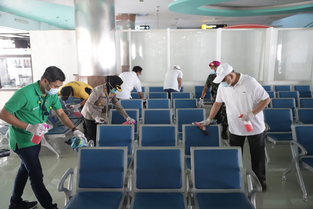 Dengan menggunakan peralatan lengkap, para petugas gabungan menyemprot disinfektan di sejumlah lokasi terminal penumpang salah satunya Gapura Surya Nusantara yang memiliki resiko penularan virus corona.