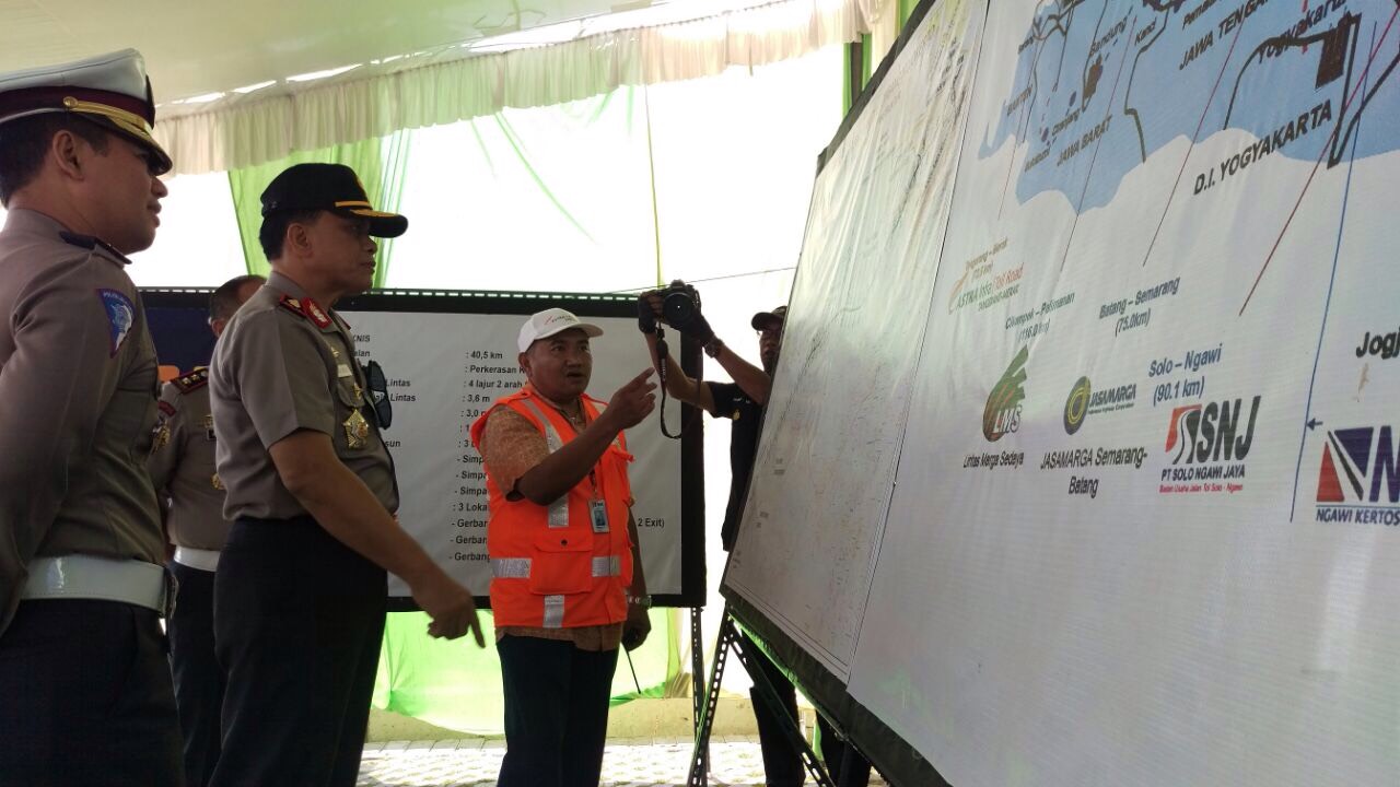 Brigjen Pol Widodo Eko Prihastopo mengecek kesiapan rest area di KM 696 sekitar pukul 08.45 Wib. Rombongan disambut Yanuar, Kepala Departemen Pelayanan Lalu Lintas dan Hubungan Eksternal Astra Infra Tol Road Jombang-Mojokerto.