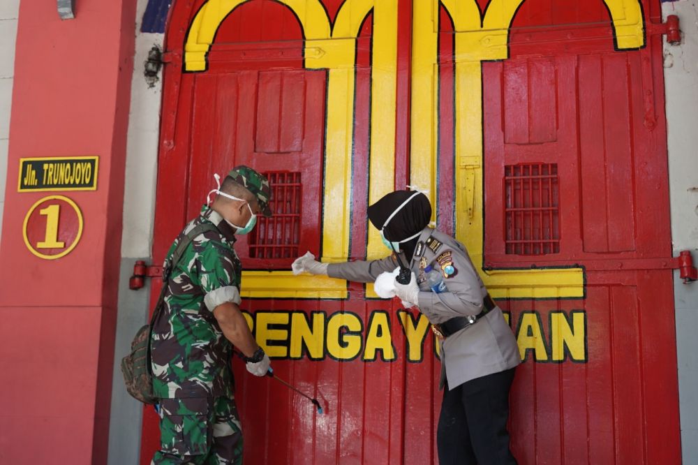 jatimnow.com - Tim gabungan dari jajaran Polres Probolinggo Kota, Kodim 0820, Yon Zipur, Dinas Kesehatan dan Satpol PP melakukan aksi pencegahan Virus Corona (Covid-19) dengan melakukan penyemprotan disinfektan.