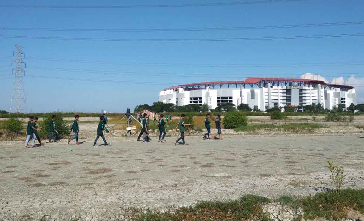 Sebagian memilih jalan pintas menuju stadion dengan melewati tambak yang mengering.