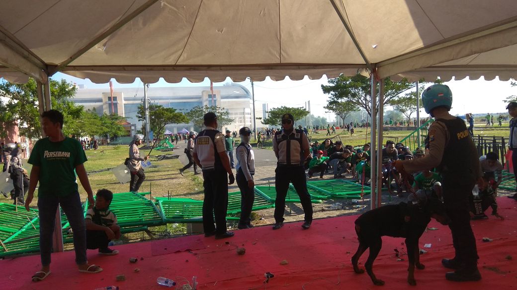 Polisi berusaha menghalau para bonek. Gas air mata ditembakkan. Selain itu, polisi yang membawa tameng juga menghalau dengan pentungan. Bonek yang mengenakan kaos hijau semburat menyelamatkan diri.