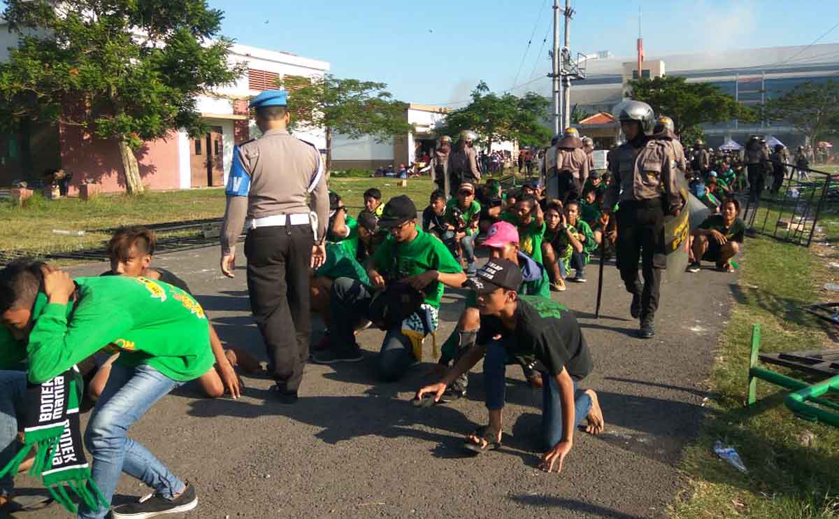 Suasana berubah kondusif saat para bonek diizinkan masuk stadion. Meski berjalan jongkok, para bonek terlihat senang dengan bertepuk tangan dan memuji petugas polisi.