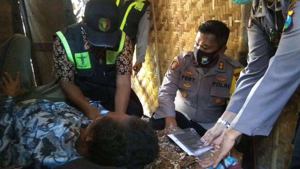 Saat pembagian paket sembako, Kapolres dan Srikandi Majapahit menemukan seorang pria hidup digubuk hidup sendirian dengan kondisi sedang sakit.