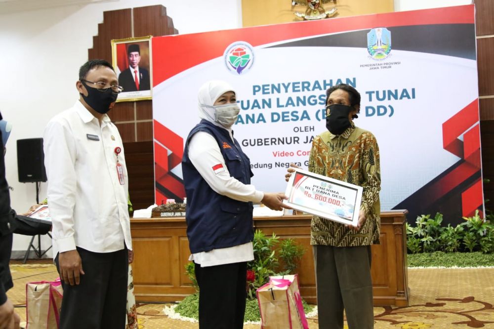 Pembagian BLT-DD dilakukan secara simbolis dan secara virtual dari Gedung Negara Grahadi Surabaya oleh Gubernur Khofifah pada perwakilan 5 orang perwakilan Keluarga Penerima Manfaat (KPM) dari Desa Cangkir, Kecamatan Driyorejo, Kabupaten Gresik serta kepada 5 orang perwakilan KPM dari Desa Badurame, Kecamatan Turi, Kabupaten Lamongan. Begitu pula kepada warga kabupaten lainnya.