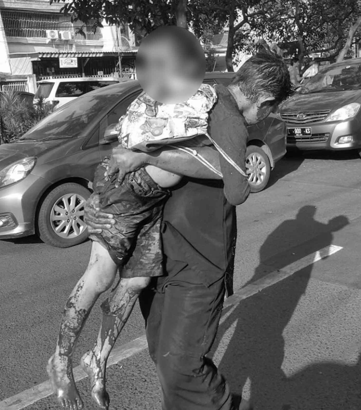 Salah seorang warga berupaya menyelamatkan bocah yang terkena ledakan bom di salah satu gereja.