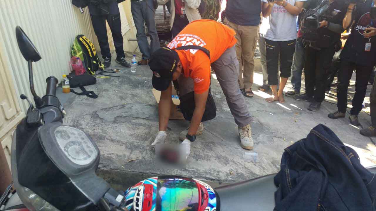 Personel Inafis tersebut, lantas naik ke atap sebuah rumah, dan mengambil sebuah benda yang diduga salah satu serpihan tubuh korban ledakan bom.