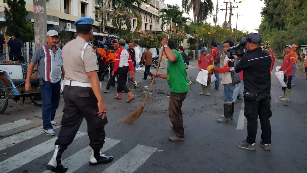 Sementara itu, terlihat petugas kebersihan dari Dinas Kebersihan dan Pertamanan (DKP) Pemerintah Kota (Pemkot) Surabaya mulai bekerja membersihkan serpihan-serpihan sisa ledakan di sekitar Gereja.