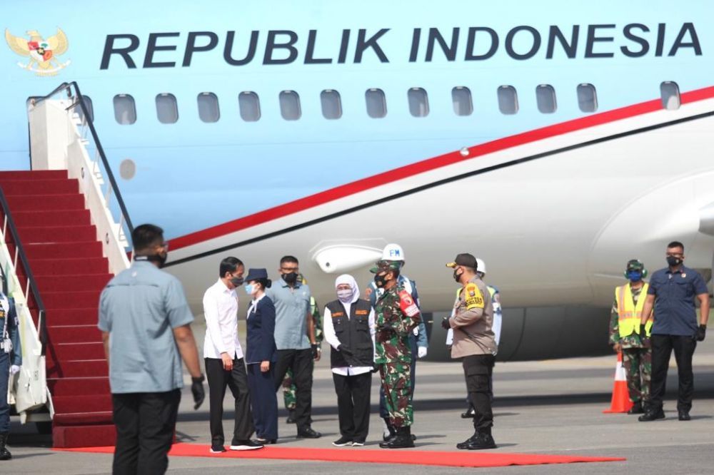 Bersama rombongan, Presiden Jokowi turun dari pesawat kepresidenan disambut oleh Gubernur Jatim Khofifah Indar Parawansa, Pangdam V Brawijaya dan Kapolda Jatim.
