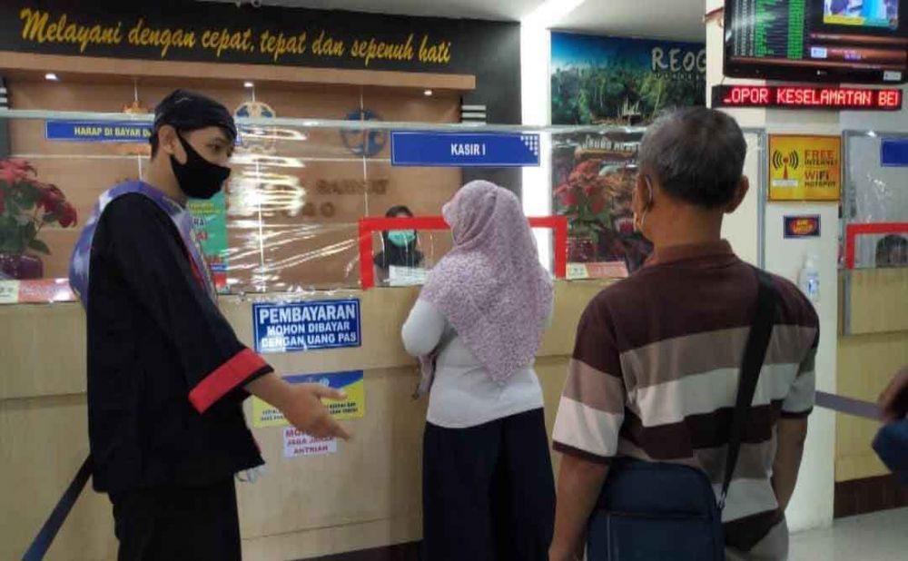 Petugas yang menggunakan atribut warok menyambut warga yang akan membayar pajak kendaraan dengan mengarahkan terlebih dahulu untuk mencuci tangan dan mengenakan masker sebelum masuk ke ruang pelayanan.